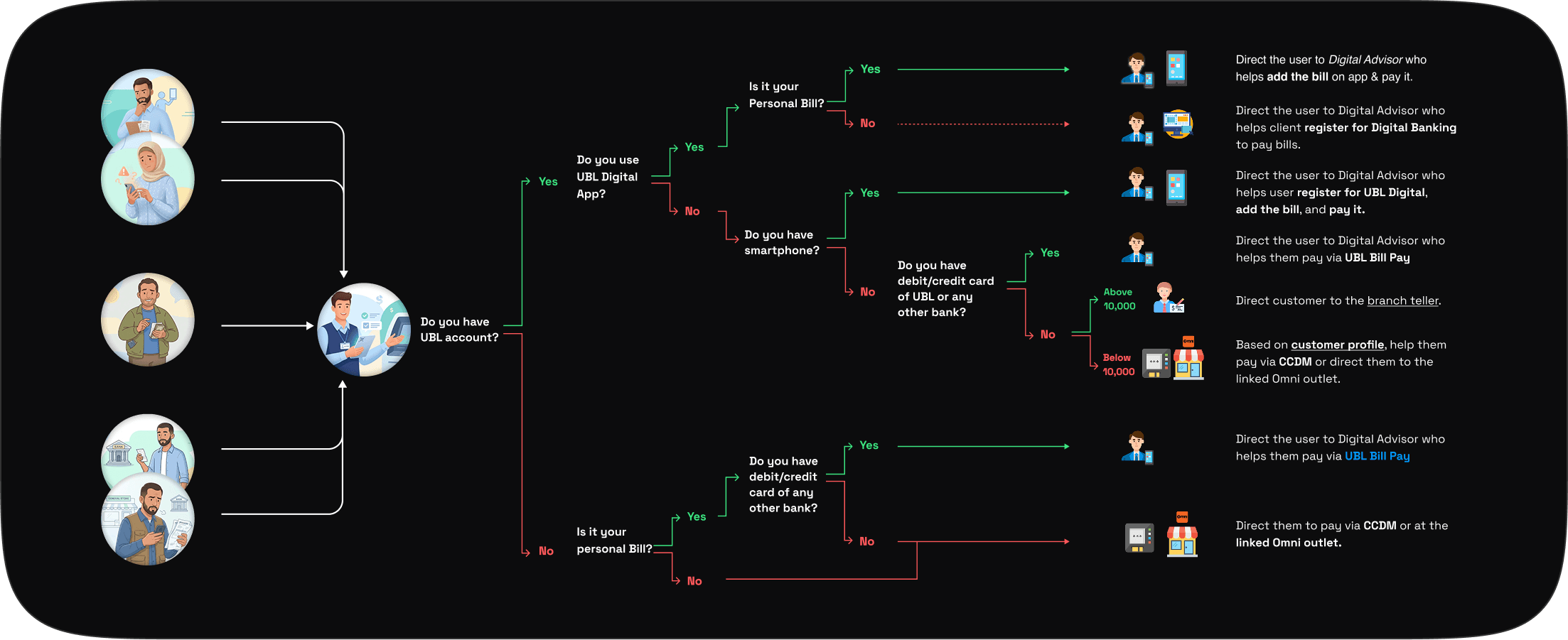 Through branch visits, interviews, and field research across 25 branches, I identified five major audience segments walking into branches: